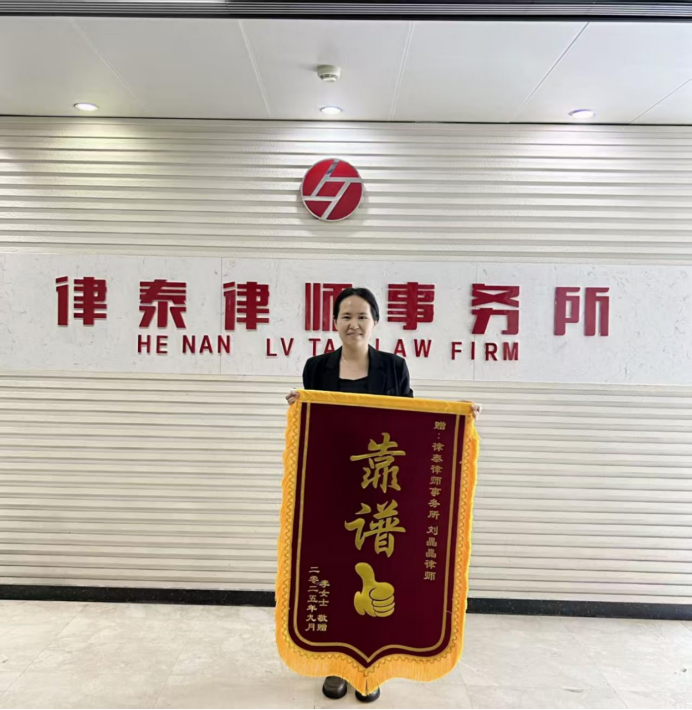 专业服务彰显法治温度。2025年9月26日下午, 河南律泰律师事务所刘晶晶律师收到委托人李女士送来的一面锦旗。这份荣誉是委托人对律师专业能力与尽责态度的最佳褒奖,更是对律泰律所致力于提供专业、优质、高效法律服务的高度认可。