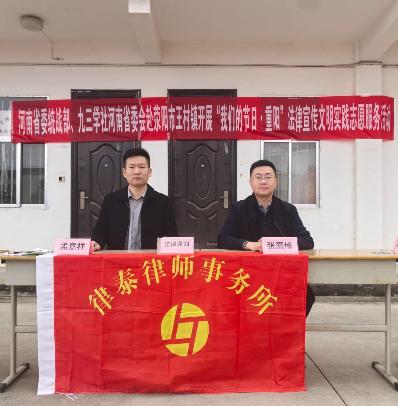岁岁重阳,今又重阳。2025年10月29日(农历九月初九),河南省委统战部、九三学社河南省委赴荥阳市王村镇开展“我们的节日・重阳”法律宣传文明实践志愿服务活动,河南律泰律师事务所受邀参加。律泰律师以专业法律知识为笔,以敬老爱老初心为墨,为当地老年人送上了一份暖心又实用的“法治重阳礼”。